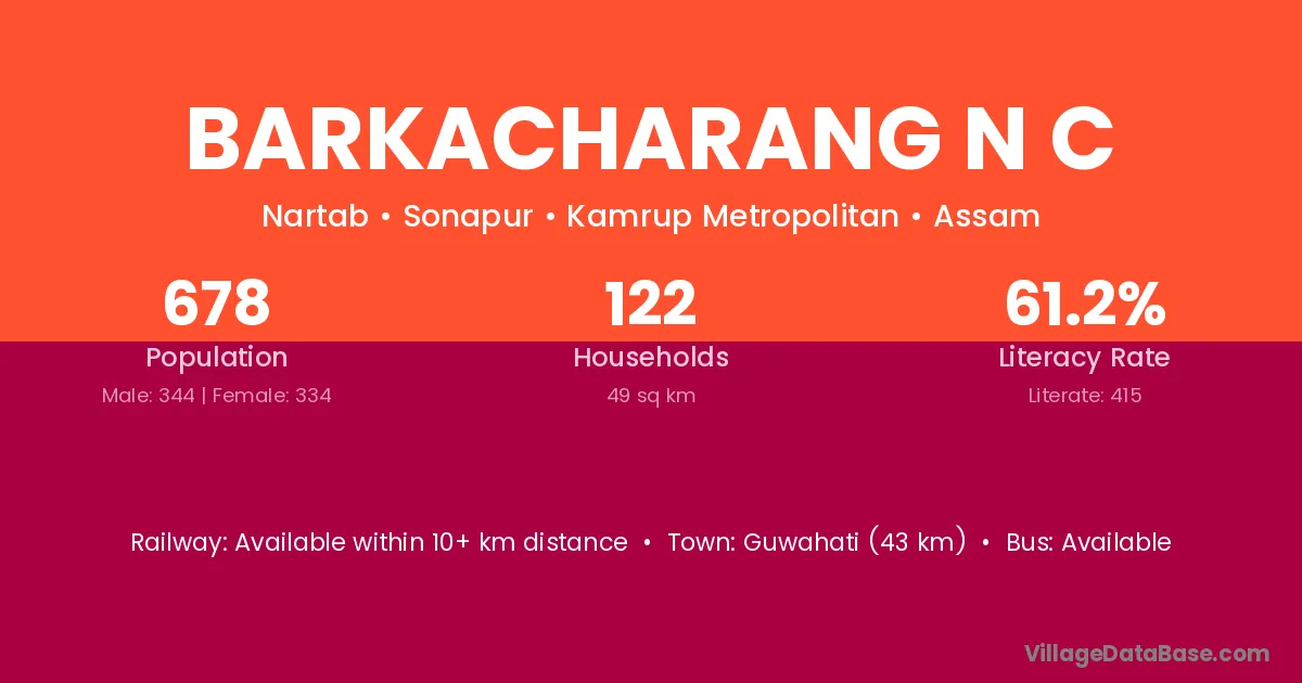 Guwahati (43 km) is the nearest town to Barkacharang N C village for major economic activities and is located approximately 43 km away.