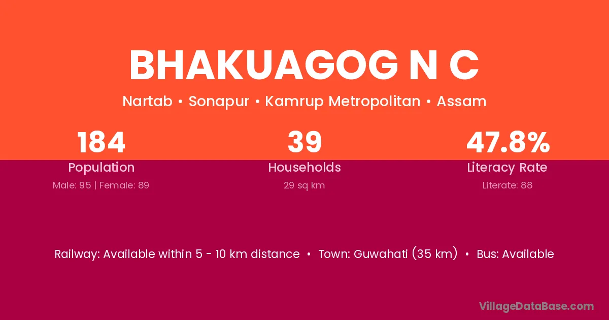 Guwahati (35 km) is the nearest town to Bhakuagog N C village for major economic activities and is located approximately 35 km away.