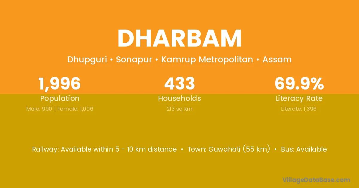 Guwahati (55 km) is the nearest town to Dharbam village for major economic activities and is located approximately 55 km away.