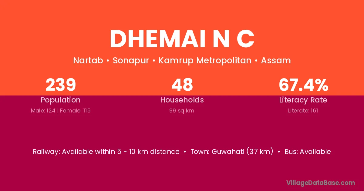 Guwahati (37 km) is the nearest town to Dhemai N C village for major economic activities and is located approximately 37 km away.