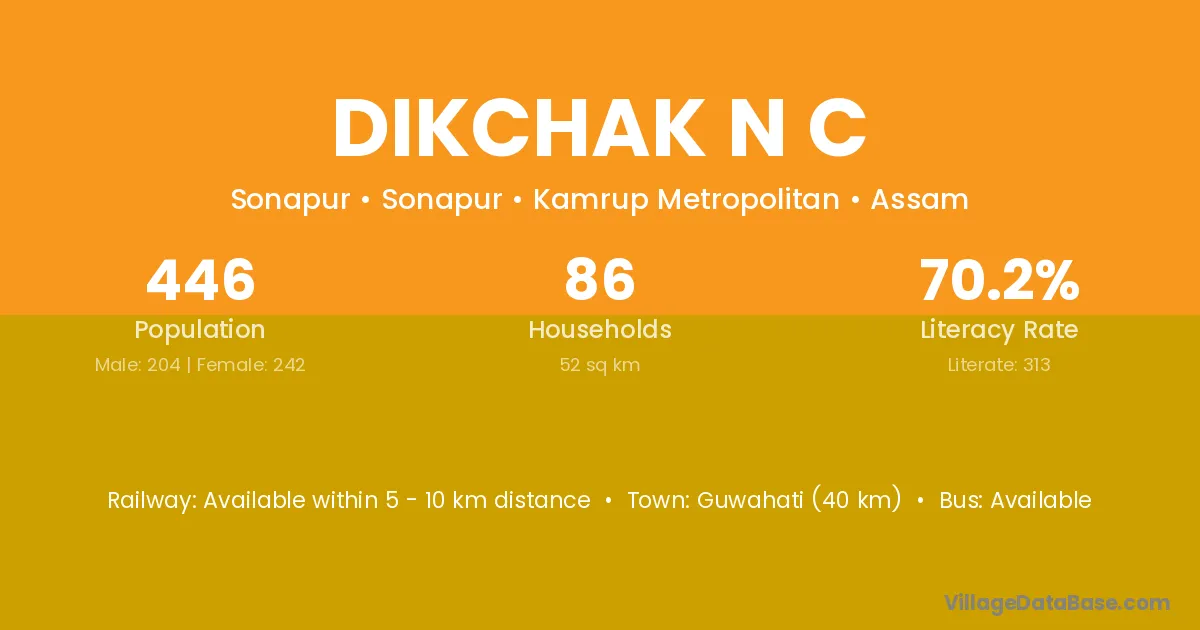 Guwahati (40 km) is the nearest town to Dikchak N C village for major economic activities and is located approximately 40 km away.