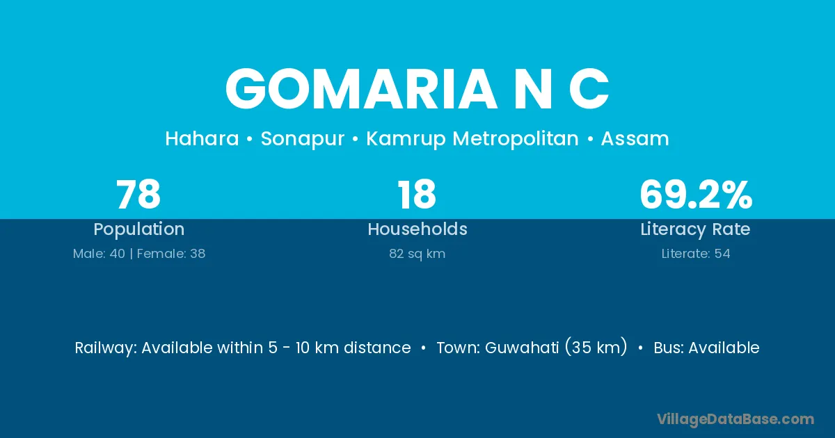 Guwahati (35 km) is the nearest town to Gomaria N C village for major economic activities and is located approximately 35 km away.