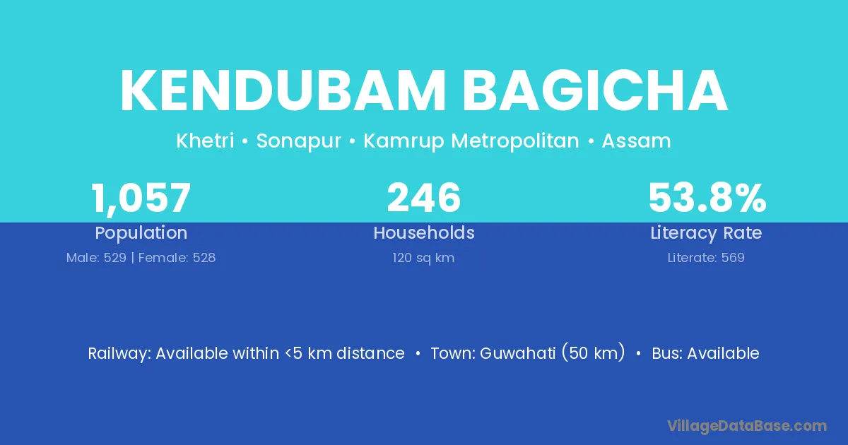 Guwahati (50 km) is the nearest town to Kendubam Bagicha village for major economic activities and is located approximately 50 km away.