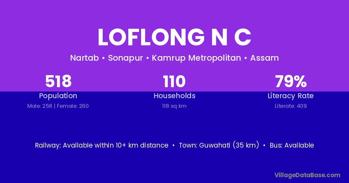 Guwahati (35 km) is the nearest town to Loflong N C village for major economic activities and is located approximately 35 km away.