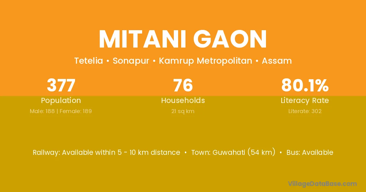 Mitani Gaon village has a total population of 377 people, of which 188 are males and 189 are females.