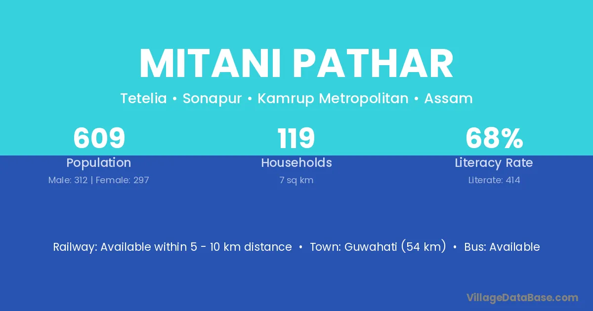 Guwahati (54 km) is the nearest town to Mitani Pathar village for major economic activities and is located approximately 54 km away.