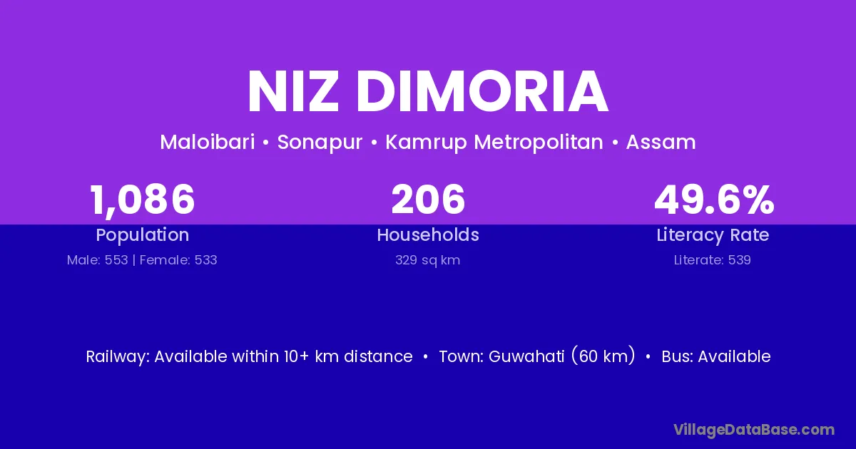 Guwahati (60 km) is the nearest town to Niz Dimoria village for major economic activities and is located approximately 60 km away.