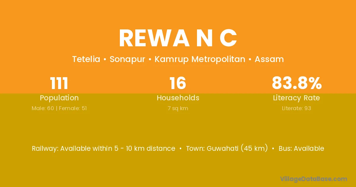 Guwahati (45 km) is the nearest town to Rewa N C village for major economic activities and is located approximately 45 km away.
