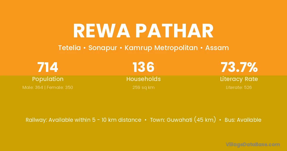 Guwahati (45 km) is the nearest town to Rewa Pathar village for major economic activities and is located approximately 45 km away.