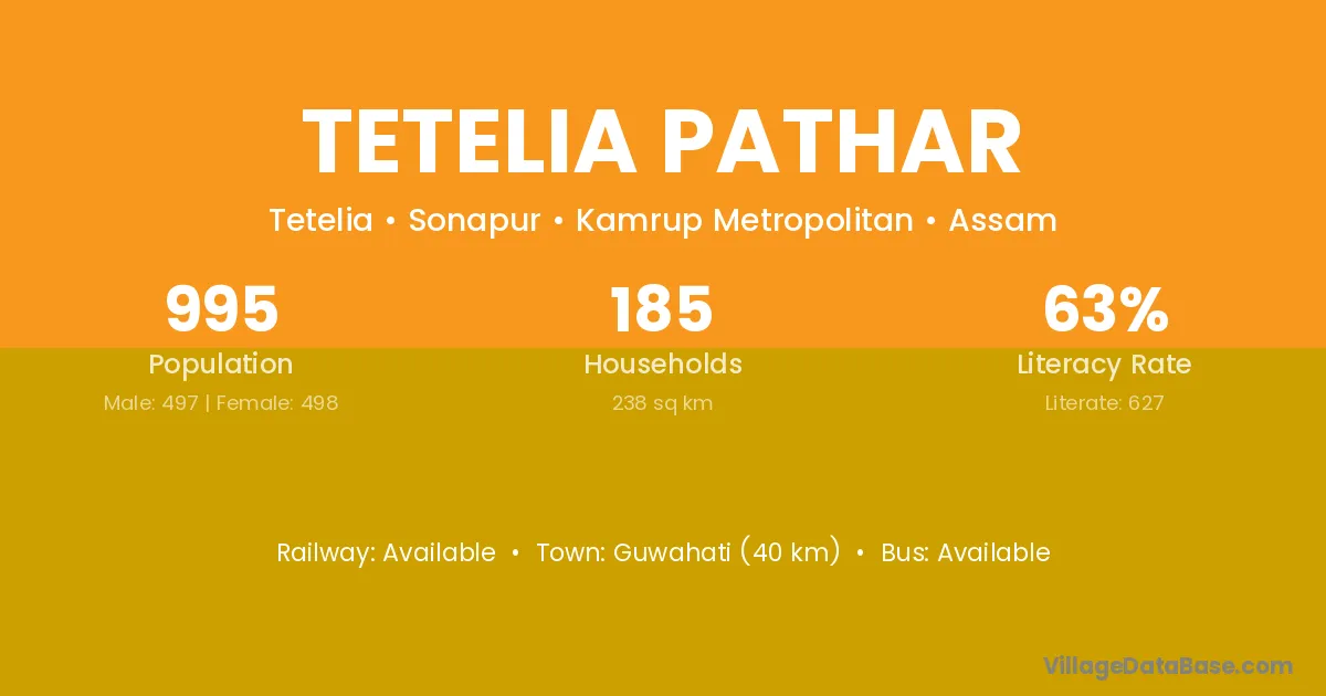 Guwahati (40 km) is the nearest town to Tetelia Pathar village for major economic activities and is located approximately 40 km away.