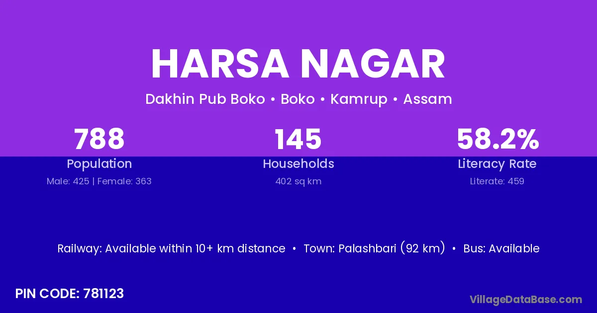 Palashbari (92 km) is the nearest town to Harsa Nagar village for major economic activities and is located approximately 92 km away.