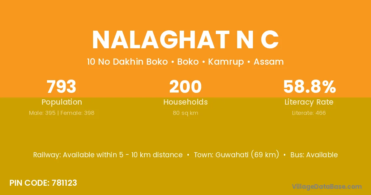 Guwahati (69 km) is the nearest town to Nalaghat N C village for major economic activities and is located approximately 69 km away.