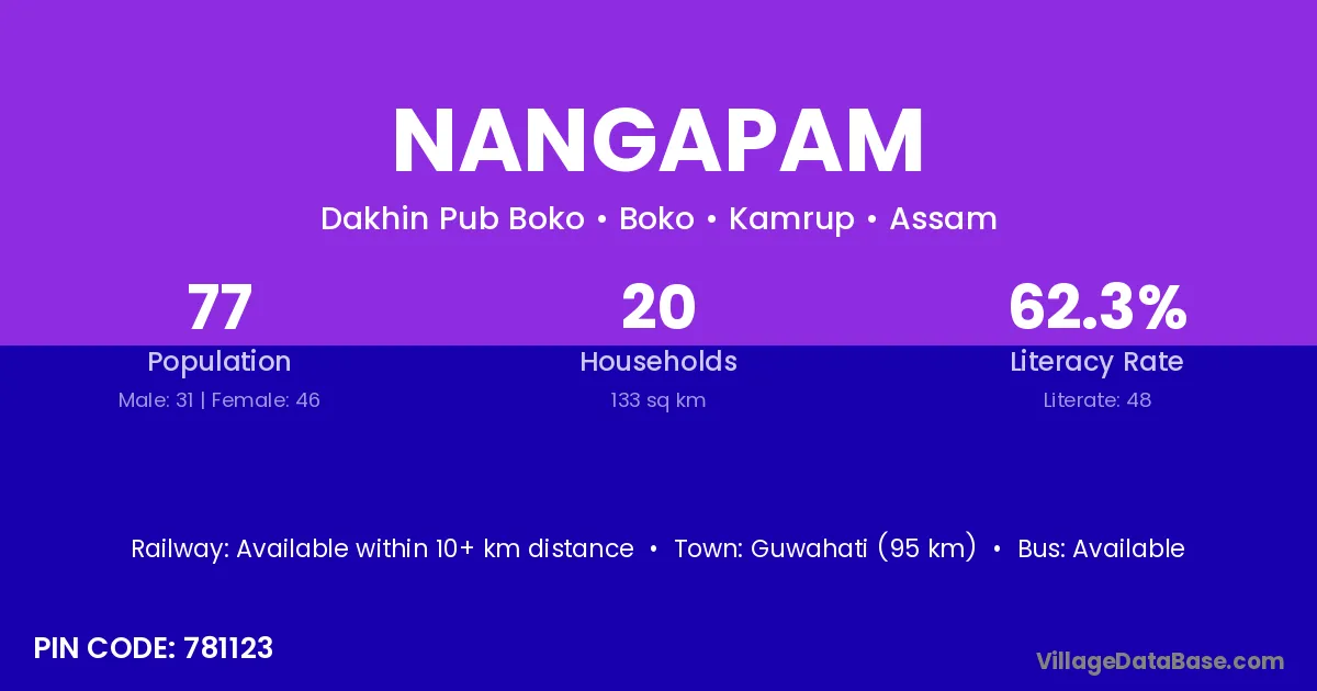 Guwahati (95 km) is the nearest town to Nangapam village for major economic activities and is located approximately 95 km away.