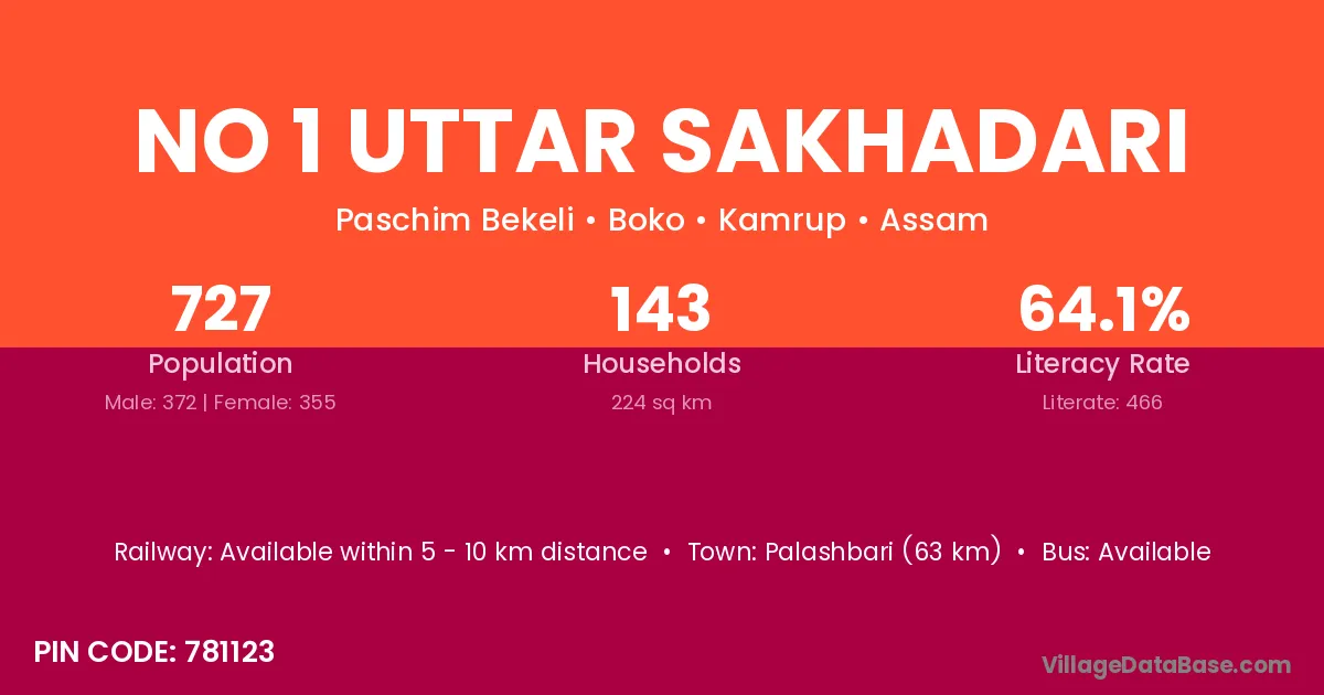 No 1 Uttar Sakhadari village has a total population of 727 people, of which 372 are males and 355 are females.