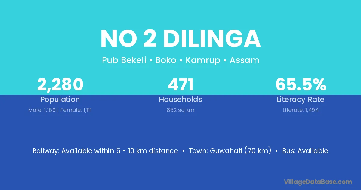Guwahati (70 km) is the nearest town to No 2 Dilinga village for major economic activities and is located approximately 70 km away.