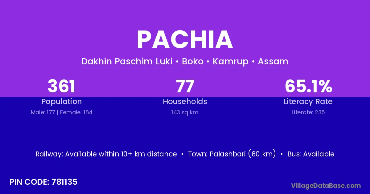 Palashbari (60 km) is the nearest town to Pachia village for major economic activities and is located approximately 60 km away.
