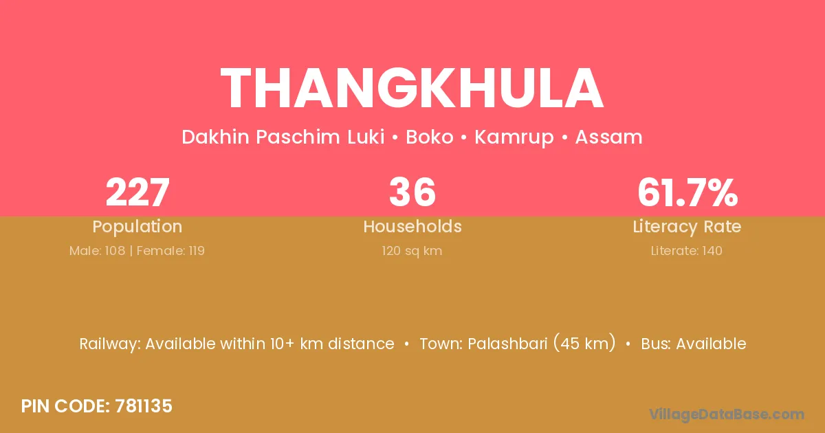 Palashbari (45 km) is the nearest town to Thangkhula village for major economic activities and is located approximately 45 km away.