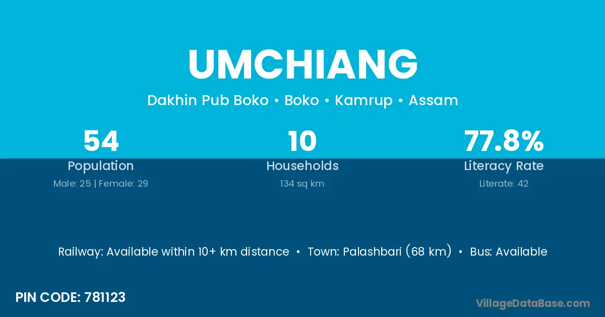 Palashbari (68 km) is the nearest town to Umchiang village for major economic activities and is located approximately 68 km away.