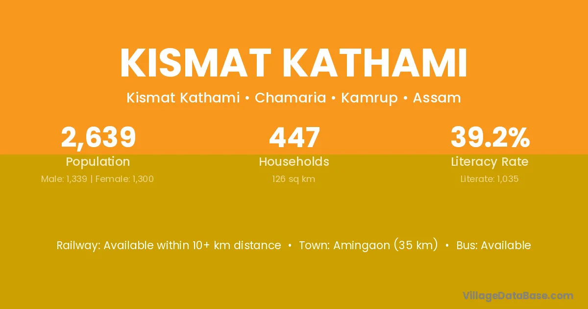 Amingaon (35 km) is the nearest town to Kismat Kathami village for major economic activities and is located approximately 35 km away.