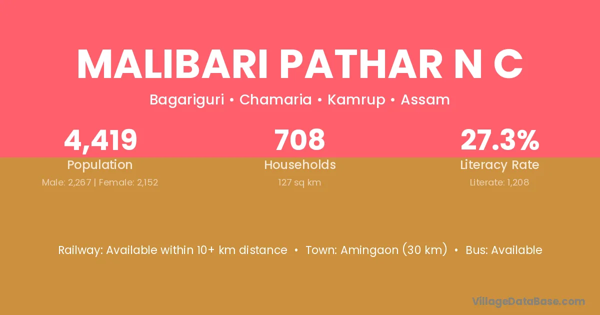 Amingaon (30 km) is the nearest town to Malibari Pathar N C village for major economic activities and is located approximately 30 km away.