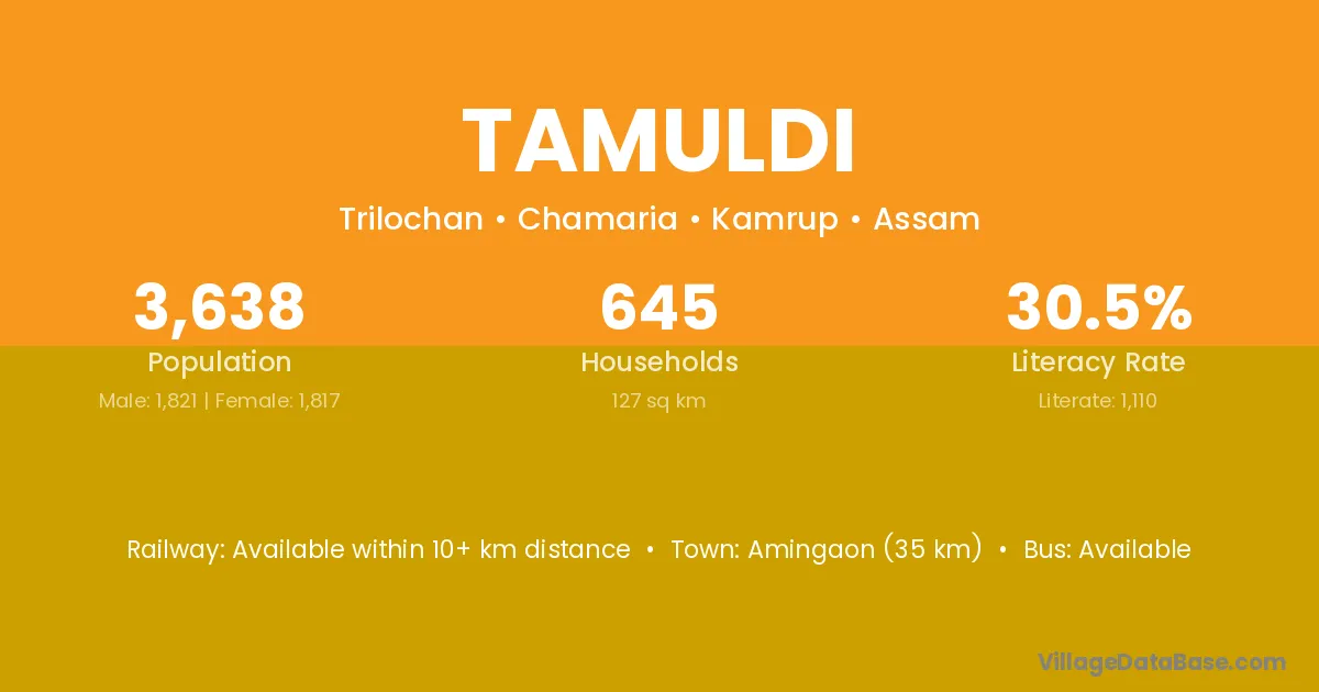 Amingaon (35 km) is the nearest town to Tamuldi village for major economic activities and is located approximately 35 km away.