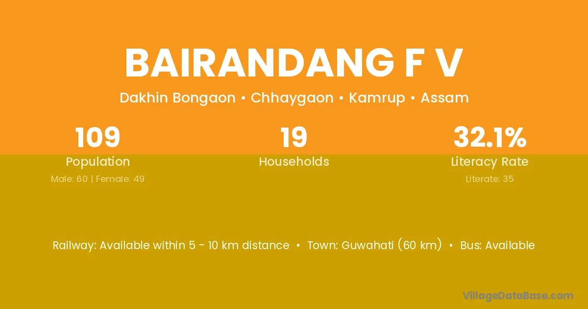 Guwahati (60 km) is the nearest town to Bairandang F V village for major economic activities and is located approximately 60 km away.