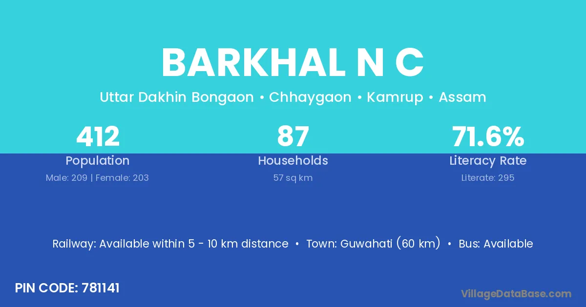 Guwahati (60 km) is the nearest town to Barkhal N C village for major economic activities and is located approximately 60 km away.