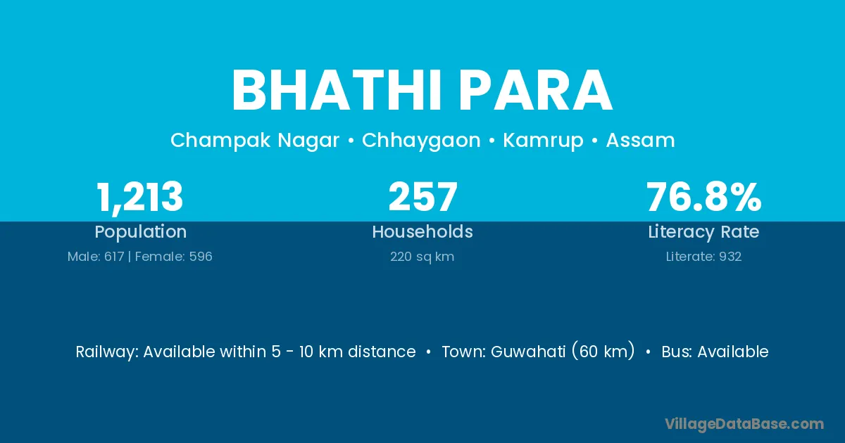 Guwahati (60 km) is the nearest town to Bhathi Para village for major economic activities and is located approximately 60 km away.
