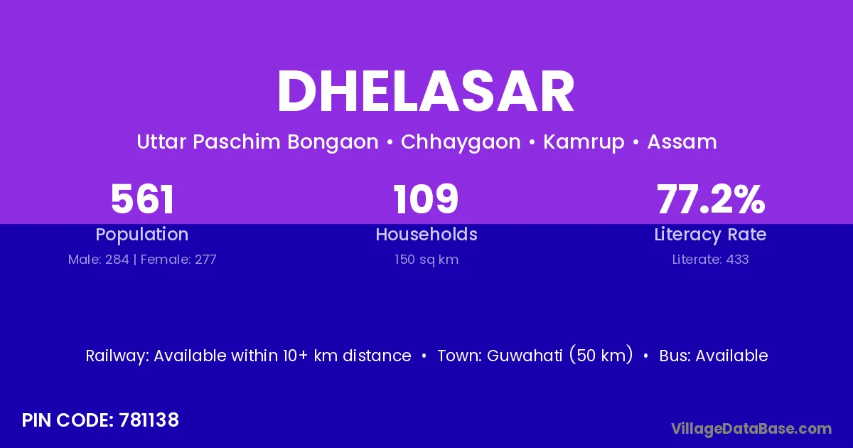 Guwahati (50 km) is the nearest town to Dhelasar village for major economic activities and is located approximately 50 km away.