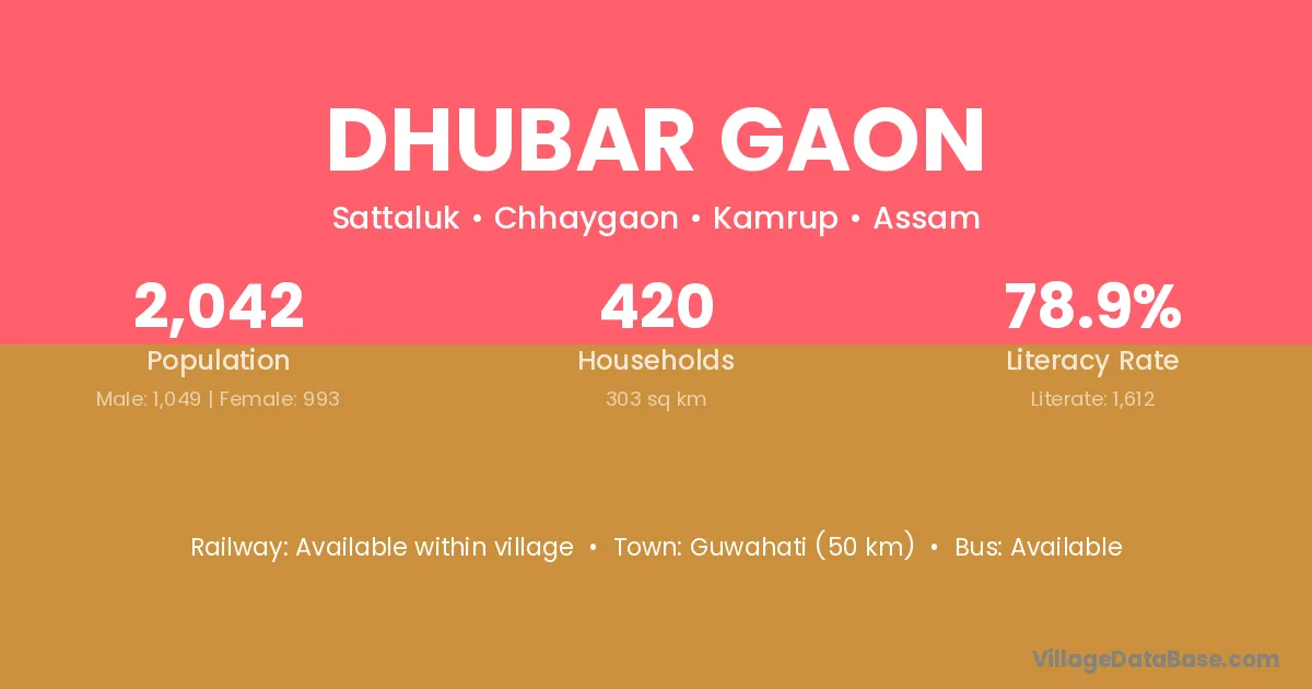 Guwahati (50 km) is the nearest town to Dhubar Gaon village for major economic activities and is located approximately 50 km away.