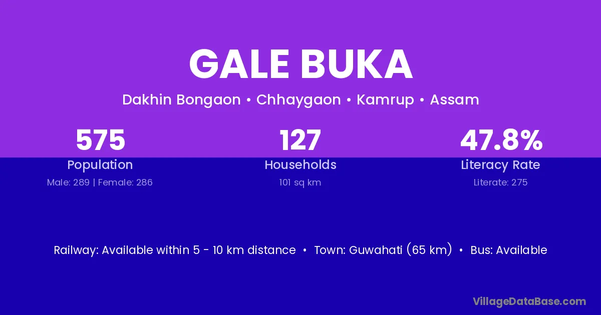 Guwahati (65 km) is the nearest town to Gale Buka village for major economic activities and is located approximately 65 km away.