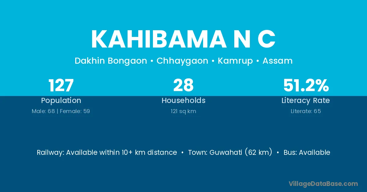 Guwahati (62 km) is the nearest town to Kahibama N C village for major economic activities and is located approximately 62 km away.