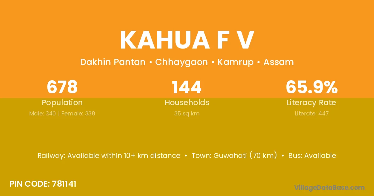 Guwahati (70 km) is the nearest town to Kahua F V village for major economic activities and is located approximately 70 km away.