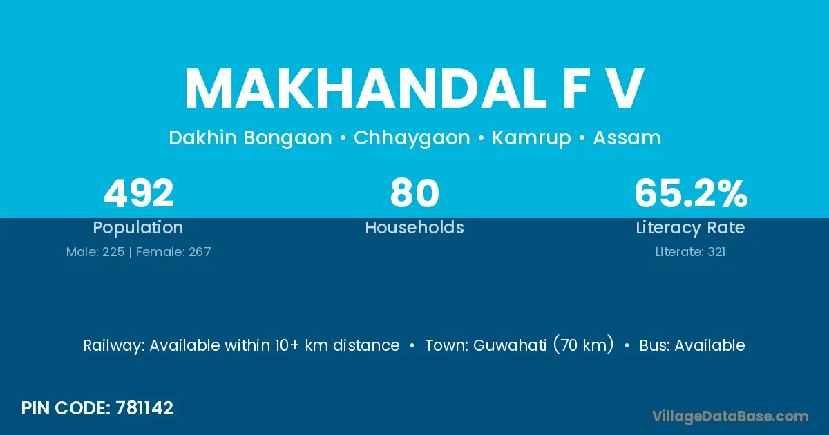 Guwahati (70 km) is the nearest town to Makhandal F V village for major economic activities and is located approximately 70 km away.