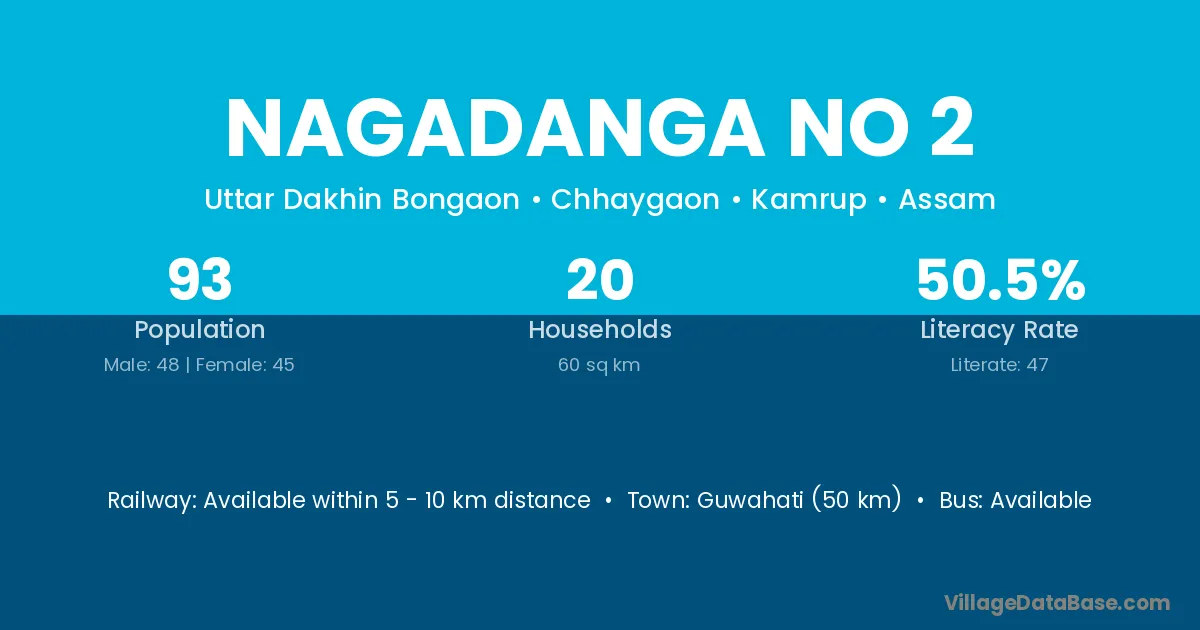 Guwahati (50 km) is the nearest town to Nagadanga No 2 village for major economic activities and is located approximately 50 km away.