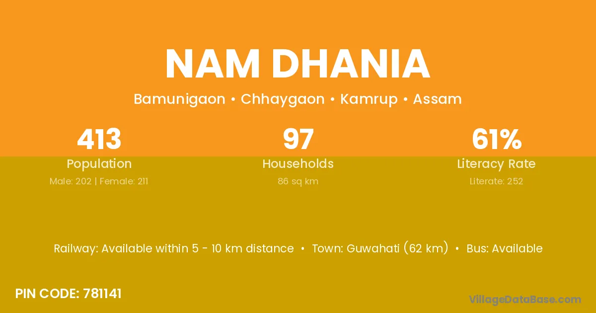 Guwahati (62 km) is the nearest town to Nam Dhania village for major economic activities and is located approximately 62 km away.