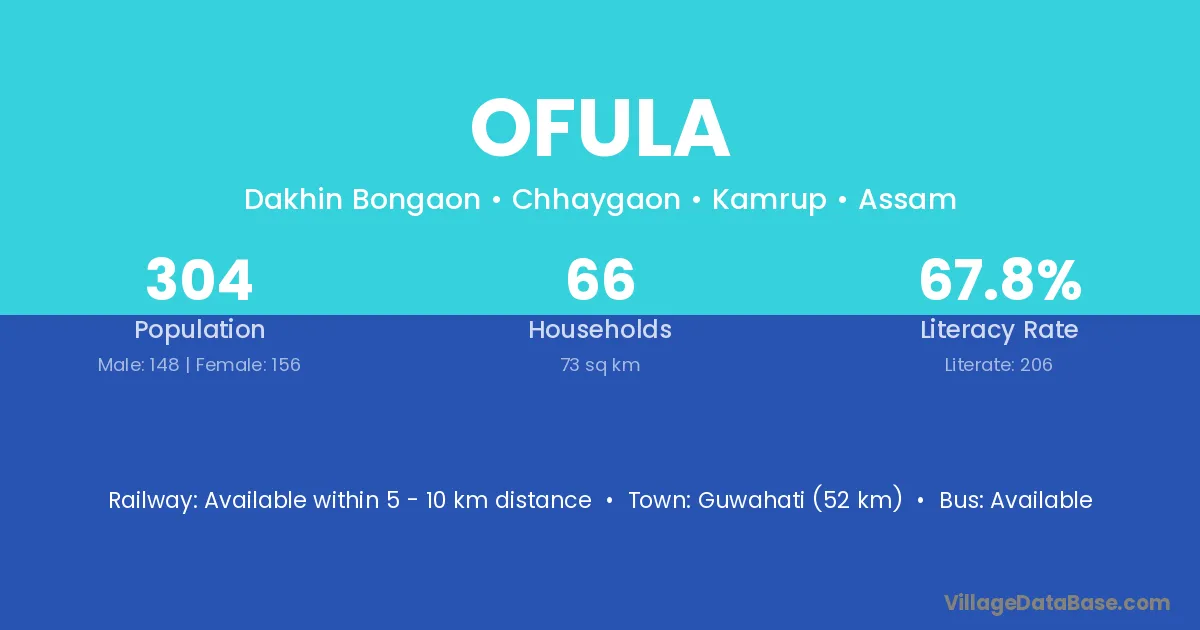 Guwahati (52 km) is the nearest town to Ofula village for major economic activities and is located approximately 52 km away.