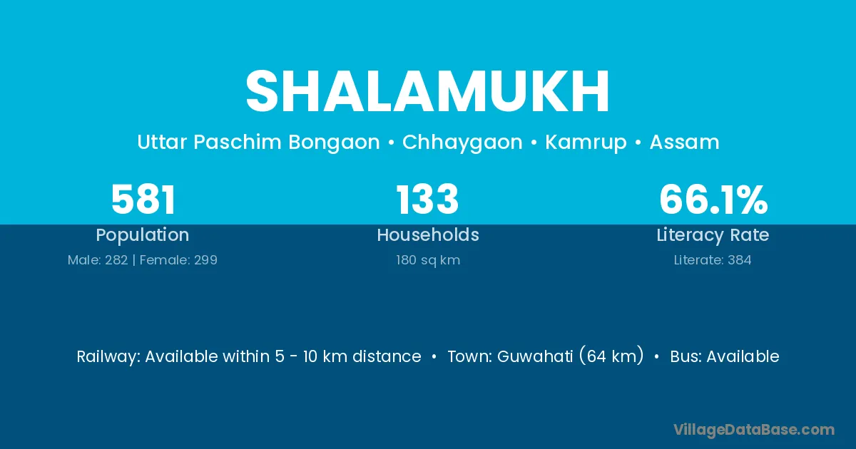 Guwahati (64 km) is the nearest town to Shalamukh village for major economic activities and is located approximately 64 km away.
