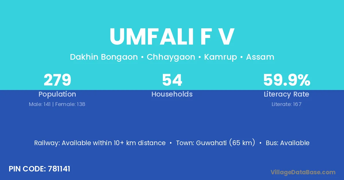 Guwahati (65 km) is the nearest town to Umfali F V village for major economic activities and is located approximately 65 km away.