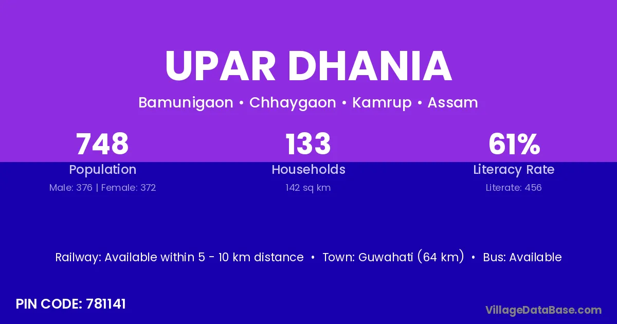 Guwahati (64 km) is the nearest town to Upar Dhania village for major economic activities and is located approximately 64 km away.