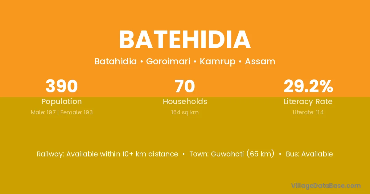 Guwahati (65 km) is the nearest town to Batehidia village for major economic activities and is located approximately 65 km away.