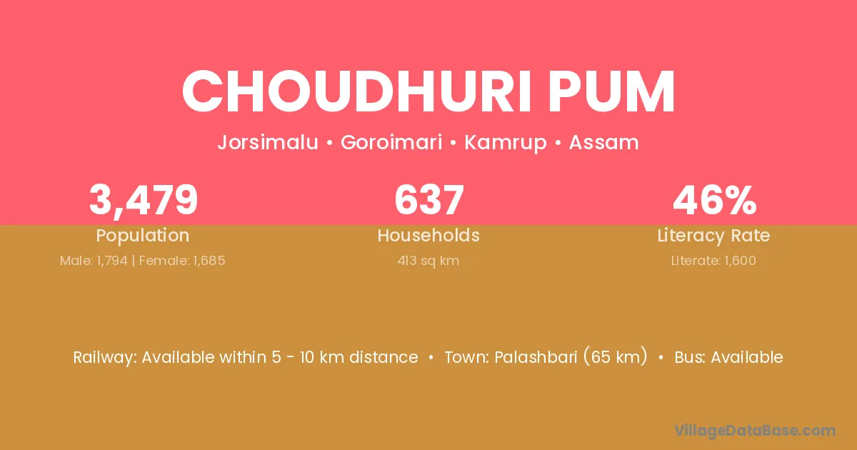 Palashbari (65 km) is the nearest town to Choudhuri Pum village for major economic activities and is located approximately 65 km away.