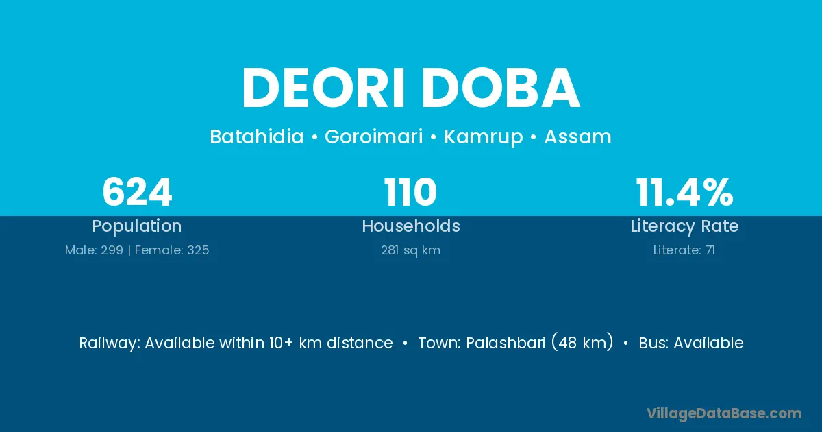 Palashbari (48 km) is the nearest town to Deori Doba village for major economic activities and is located approximately 48 km away.