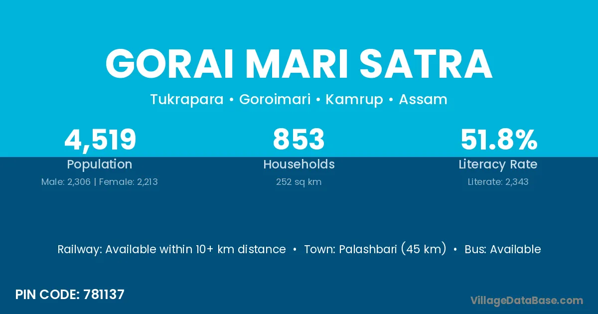 Palashbari (45 km) is the nearest town to Gorai Mari Satra village for major economic activities and is located approximately 45 km away.