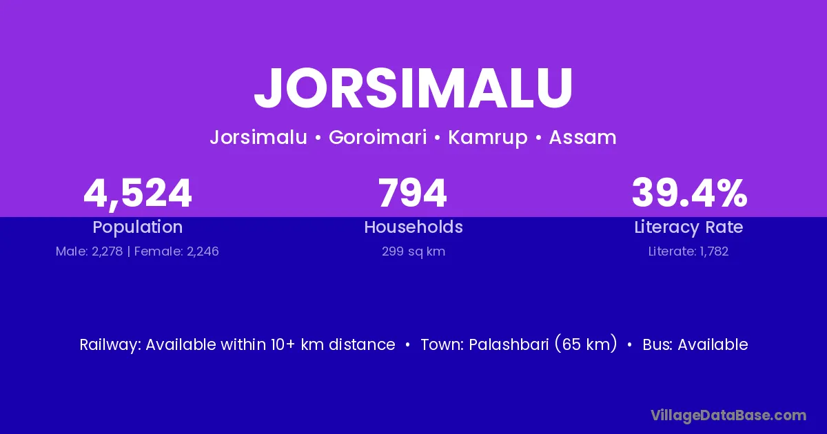 Palashbari (65 km) is the nearest town to Jorsimalu village for major economic activities and is located approximately 65 km away.
