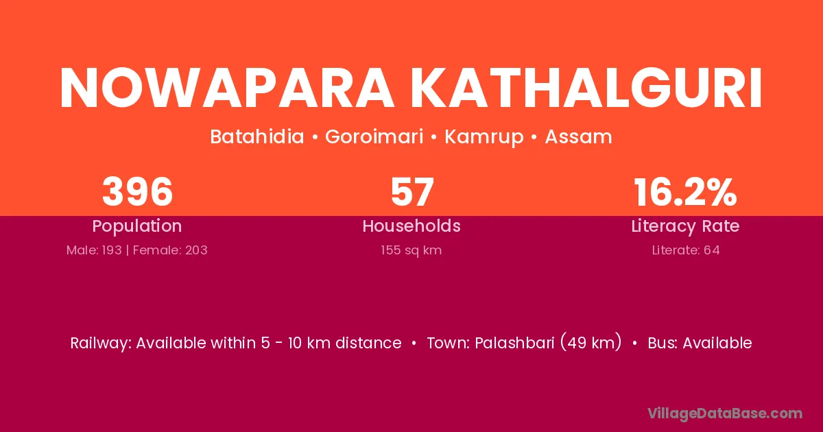 Palashbari (49 km) is the nearest town to Nowapara Kathalguri village for major economic activities and is located approximately 49 km away.