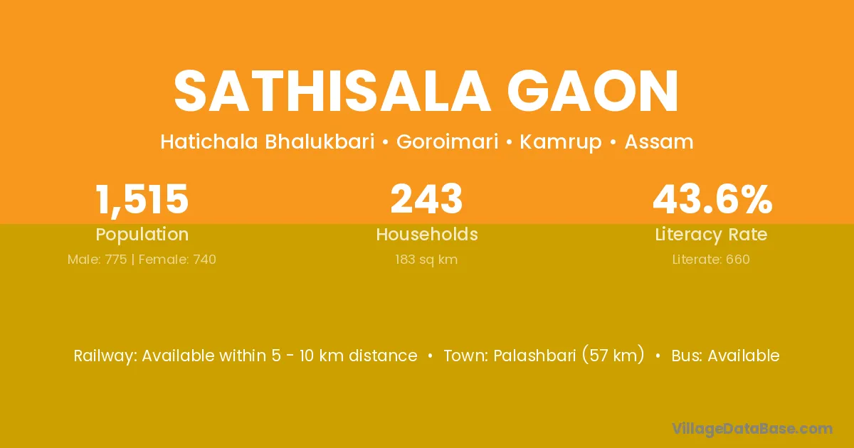Palashbari (57 km) is the nearest town to Sathisala Gaon village for major economic activities and is located approximately 57 km away.