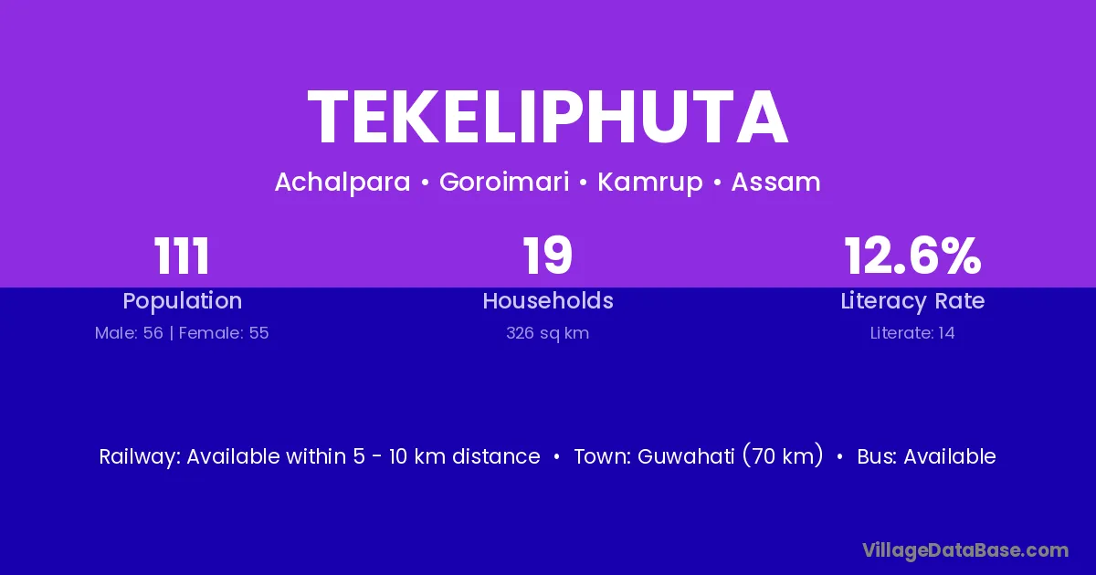 Guwahati (70 km) is the nearest town to Tekeliphuta village for major economic activities and is located approximately 70 km away.