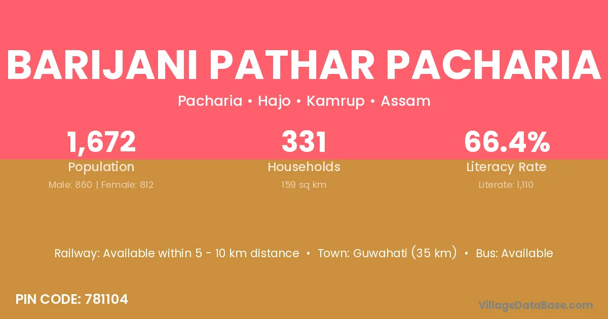 Guwahati (35 km) is the nearest town to Barijani Pathar Pacharia village for major economic activities and is located approximately 35 km away.