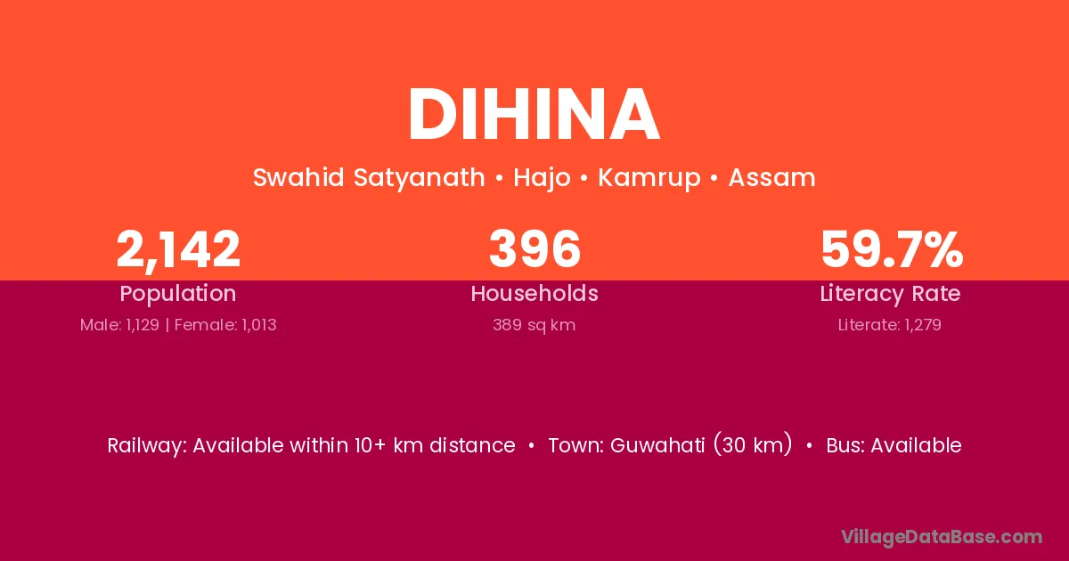 Guwahati (30 km) is the nearest town to Dihina village for major economic activities and is located approximately 30 km away.